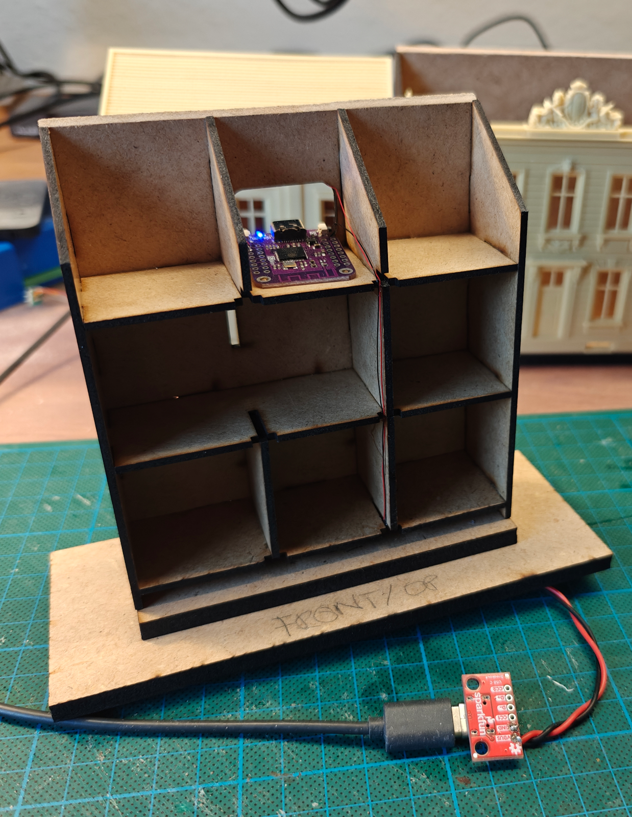 På det næste billede er jeg i gang med et hus - mere præcist ser man bagdelen til en Artitec front - mere om det projekt senere. Huset er udstyret med en S2 Mini til styring af lys, så der bliver tale om en model med egen WiFi forbindelse. Fordelen er, at huset kun skal have en 5V strømforsyning for at fungere, så der bliver minimalt brug for ledninger på anlægget. Alligevel kan man tænde og slukke lyset i hvert rum for sig, og man kan skrue op og ned for lysstyrken, så huset ikke kommer til at oplyse hele gaden. Al denne styring foregår i første omgang fra en mobiltelefon, men senere bliver det koblet til resten af modelbanen, så det også kan styres med f.eks. DCC fra min ECoS. Stadig trådløst via WiFi. Det lyder lidt vildt, men det hele kommer til at koste under 50,- kr.