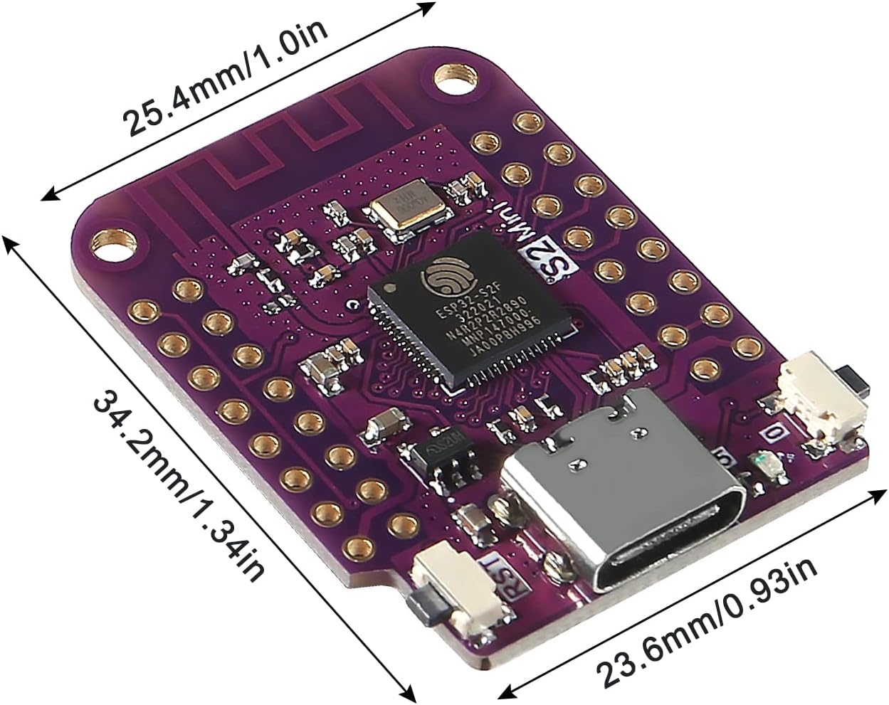 ESP32 S2 Mini er ikke fremstillet af Espressif, den er udviklet af et firma ved navn Wemos. Men det er en meget populær udgave, som jeg også er begyndt at bruge en del. Læg mærke til antennen i toppen af printet: Den er kritisk for at få WiFi og Bluetooth, og man har selv ansvaret for at få den lavet rigtigt, hvis man bruger SoC udgaven af ESP32. Selvom der er en del vejledning i databladet til chippen.