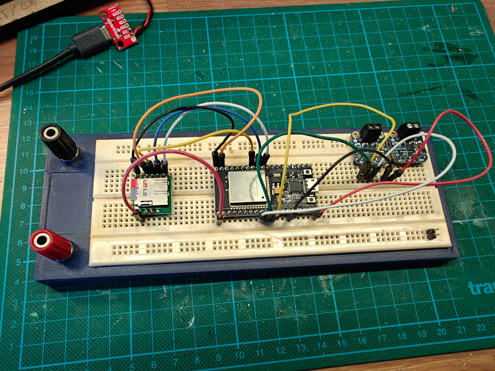 Projektet her skal bruges til et diorama/test setup af en havnekaj. I midten ses en NodeMCU, mens man til venstre ser et micro SD card med tilhørende læser: Ideen er her, at man kan lægge lyde på kortet, som så skal kunne afspilles efter behov. ESP32 kan lave digital lydbehandling, og herefter kan lyden sendes via protokollen I²S til de to små klasse D udgangsforstærkere, der ses øverst til højre. Mit diorama har to små højttalere indbygget, så man kan få mågeskrig i stereo.