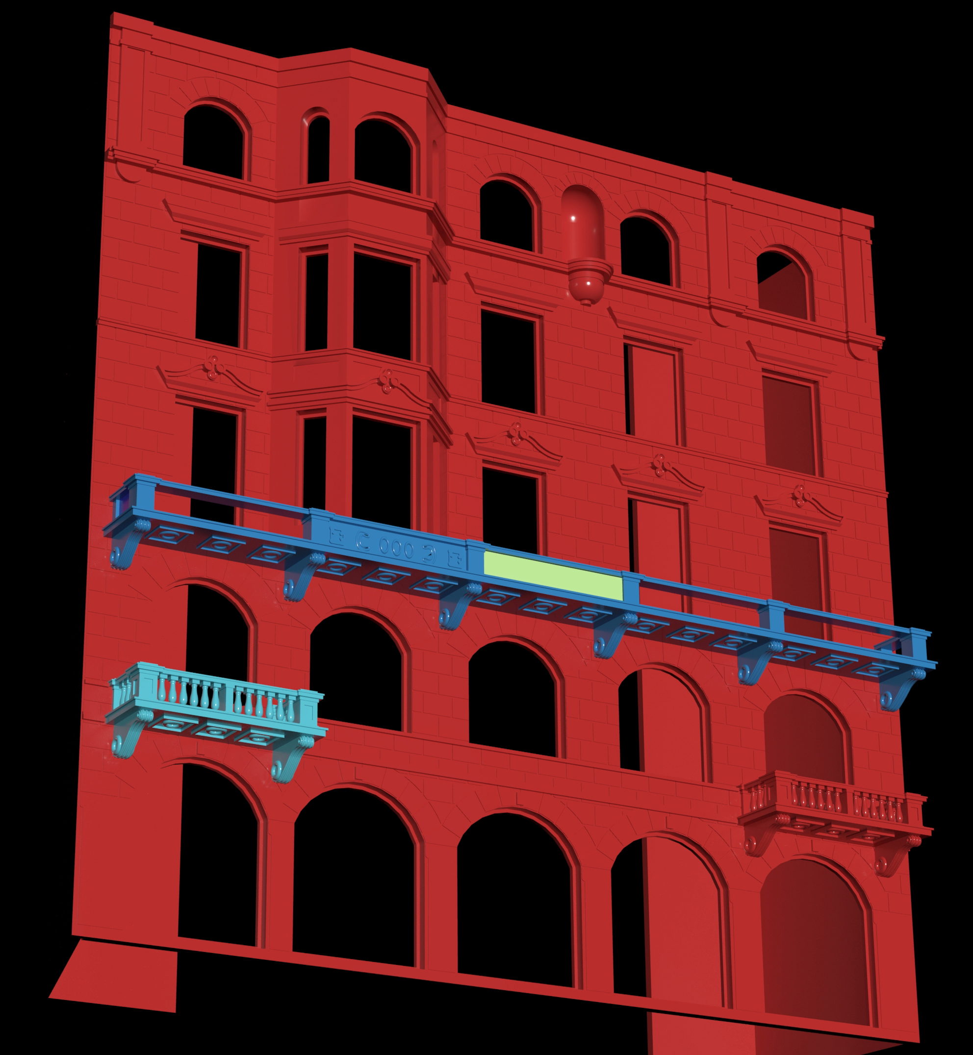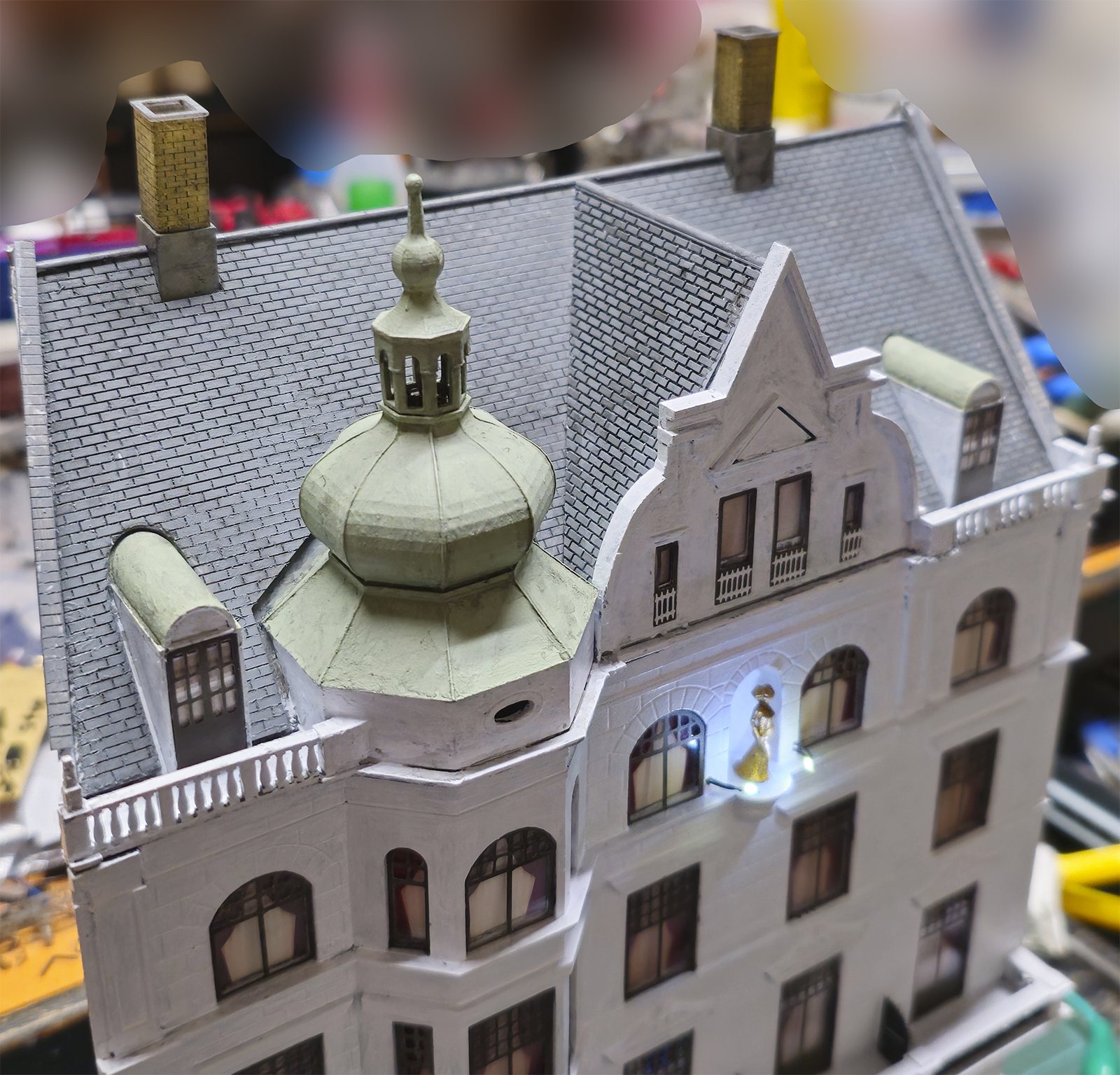 Alt er tegnet i 3DsMax og lavet i 3D print, undtagen vinduesglas som er fræst, og vinduerne som er skåret i selvklæbende vinyl.