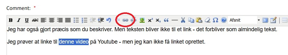 Hvad enten jeg i indlægget indsætter en titel, markerer titlen og trykker på "indsæt/rediger link" og udfylder felterne, eller indsætter url'en direkte i indlægget, og vælger "Indsæt/rediger link", så kan jeg ikke få det vist som et hyperlink, dvs. markeret med blåt.