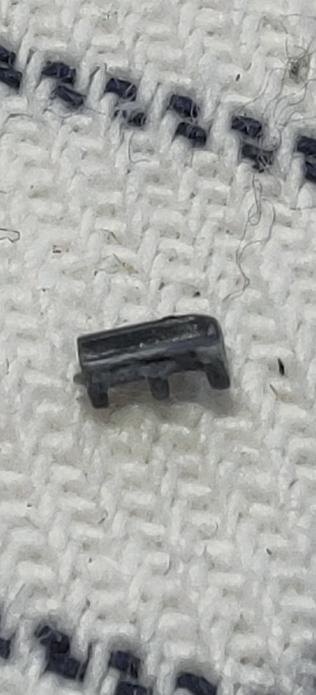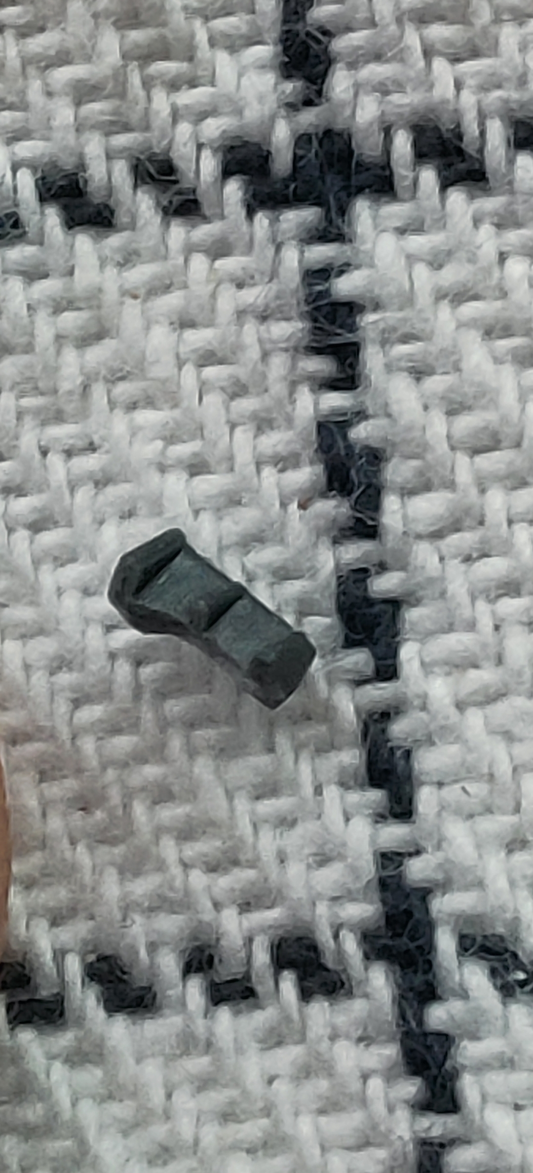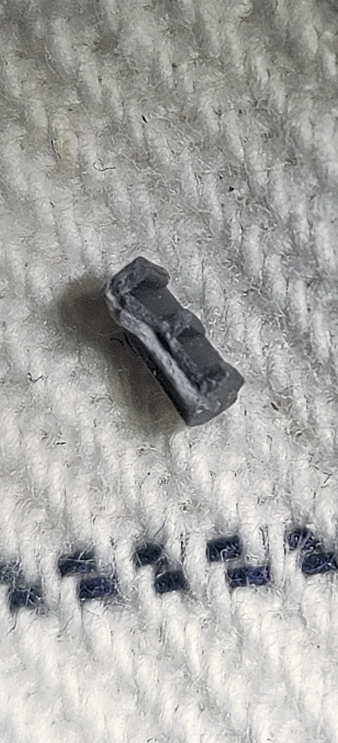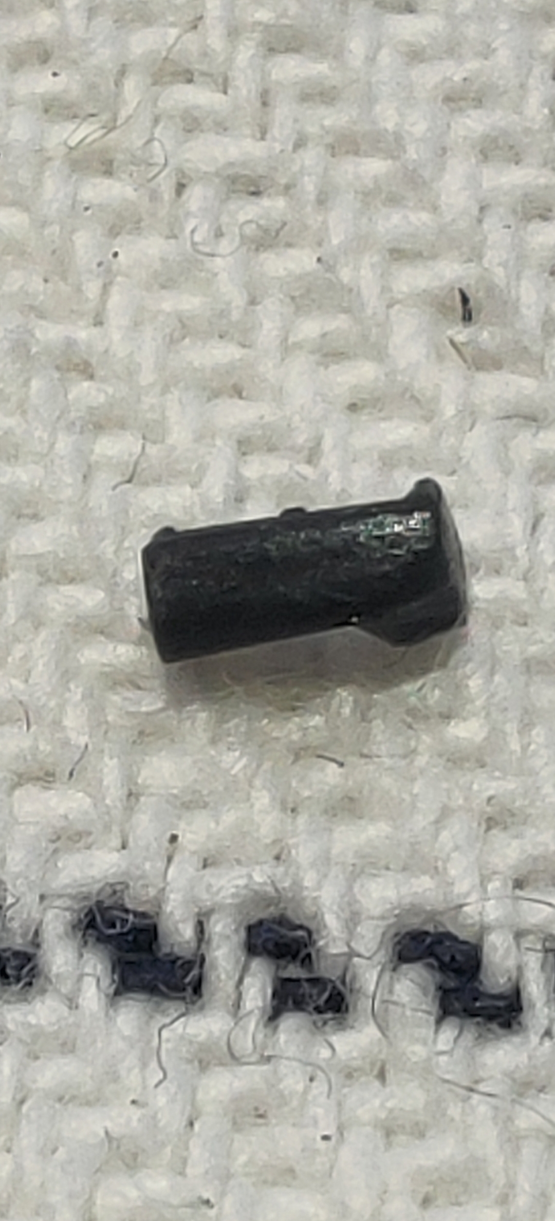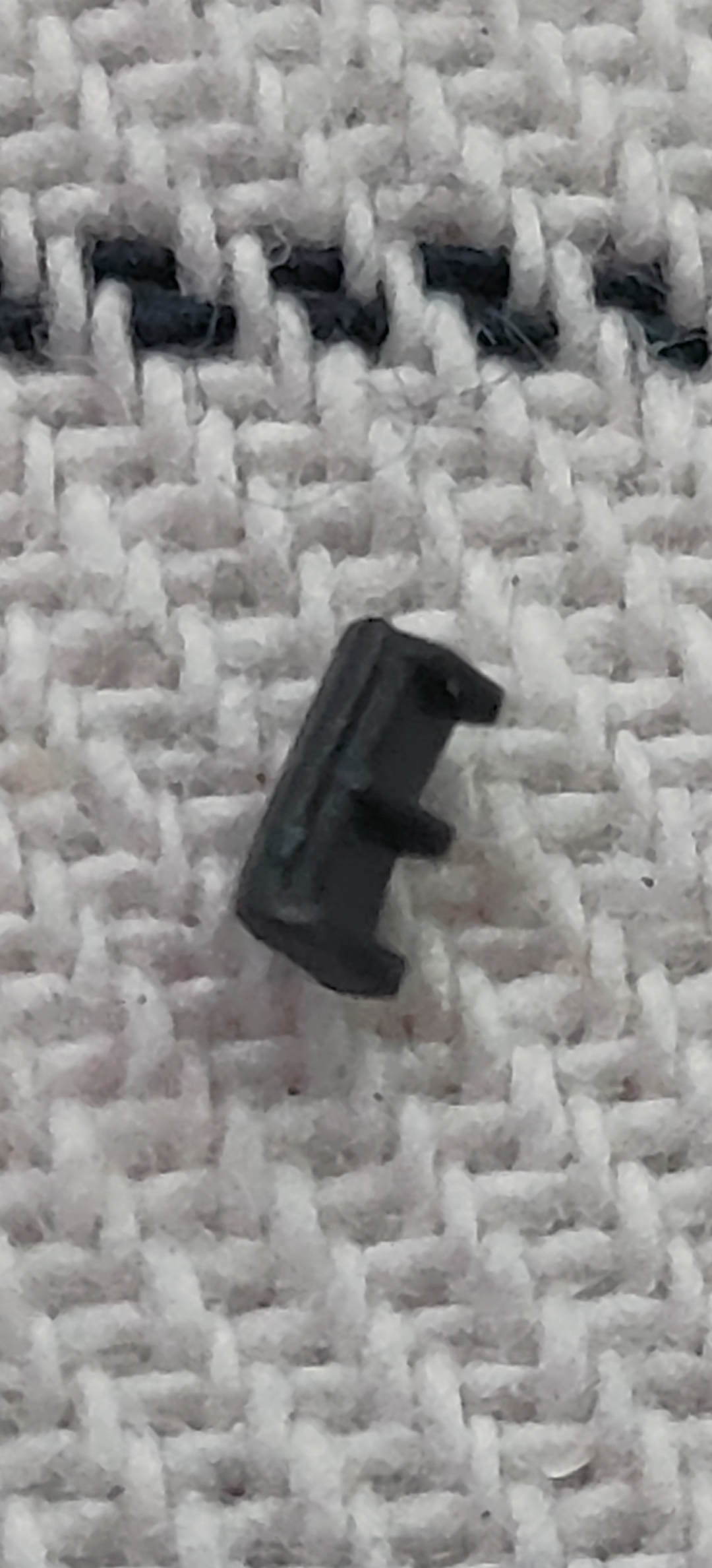 Efter at have motioneret et antal lokomotiver, og haft en del ude af vitrinen, så støder jeg pludselig på denne lille stump plastic langs sporet, lige ved siden af min CS3, ca. 4 mm lang. Jeg ved ikke om det er noget, der er brækket af et lokomotiv eller en vogn; jeg har ikke haft nogle uheld (hvor stumpen blev fundet). Jeg ved heller ikke om det overhovedet stammer fra det rullende materiel, men tanken er nærliggende.