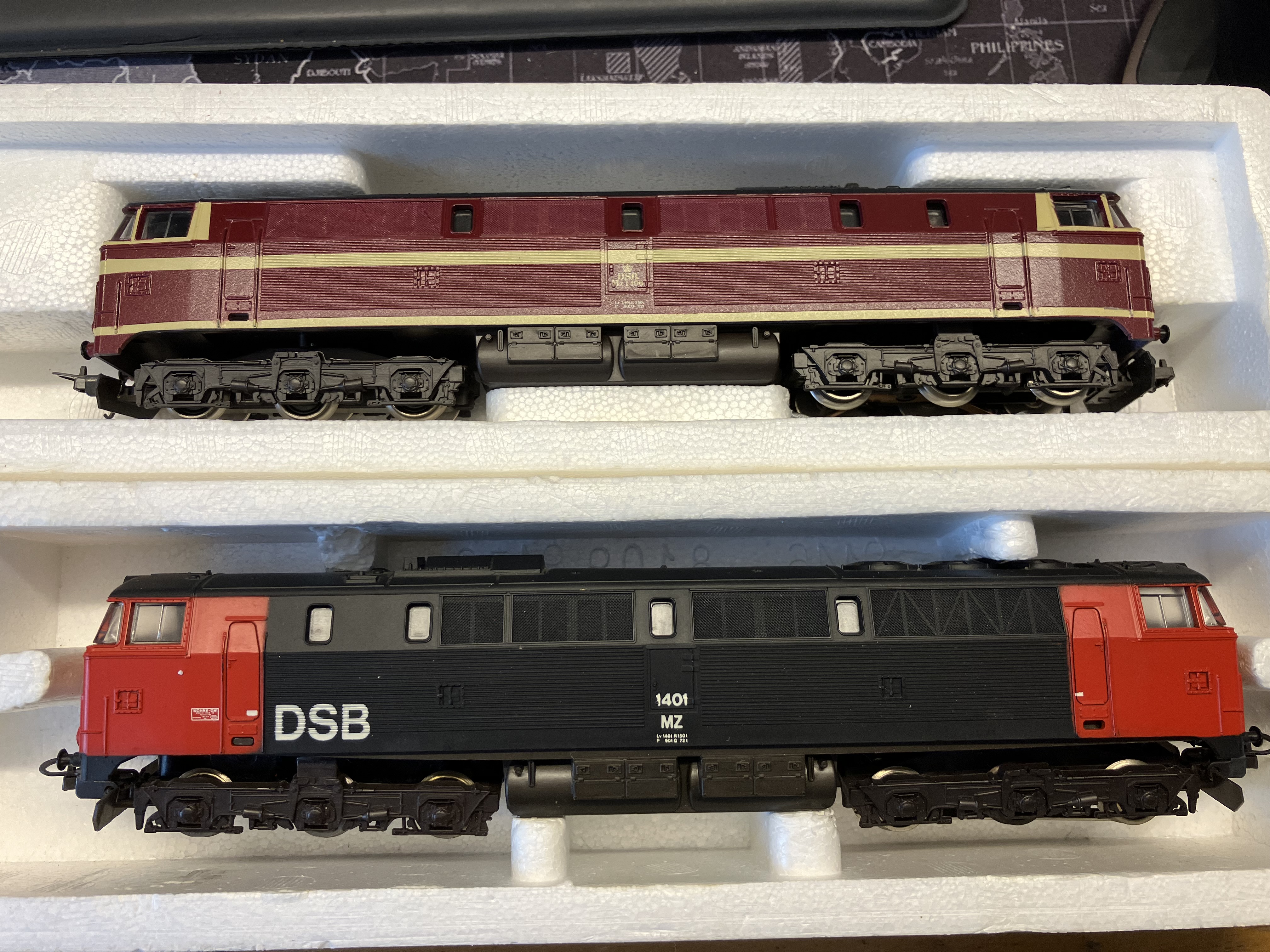 tak for svar. Ud fra det du siger vil jeg tro at det er tale om modifikation til 3-skinne drift, så bude de jo kunne køre på Märklin C-skinner med deres AC forsyning. Jeg har vedlagt billede af de 2 lokomotiver (mz1401 og mz1406 i hendholdsvis Rød/Sort og vinrød).